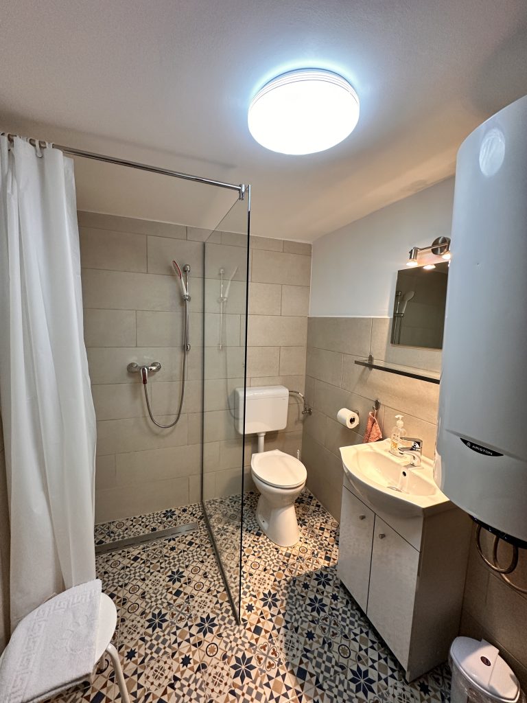 Szállásunkban két különálló fürdőszoba áll a vendégek rendelkezésére, mindkettő zuhanyzóval és WC-vel felszerelve. Ez a kialakítás kényelmes megoldást nyújt nagyobb társaságok, családok vagy hosszabb tartózkodás esetén is, hiszen egyszerre többen is kényelmesen használhatják a helyiségeket – várakozás nélkül.